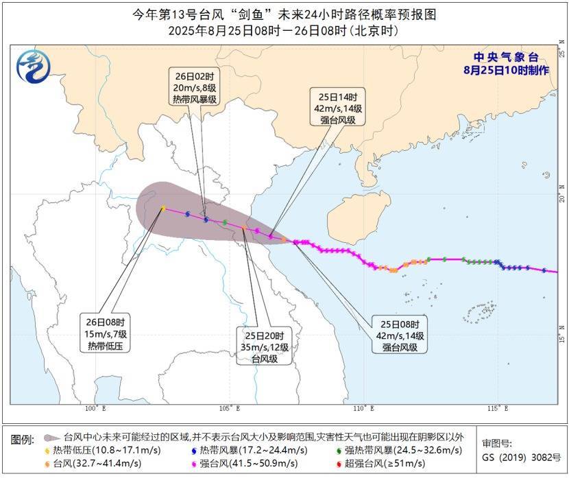大风预报:25日14时至26日14时,南海西部、西沙群岛附近海域、北部湾、琼州海峡、海南岛沿海、广西沿海、广东西部沿海将有6—8级大风,其中北部湾南部海域的风力有9—11级、阵风12—13级,“剑鱼”中心经过的附近海域或地区风力可达12—14级、阵风15—16级。